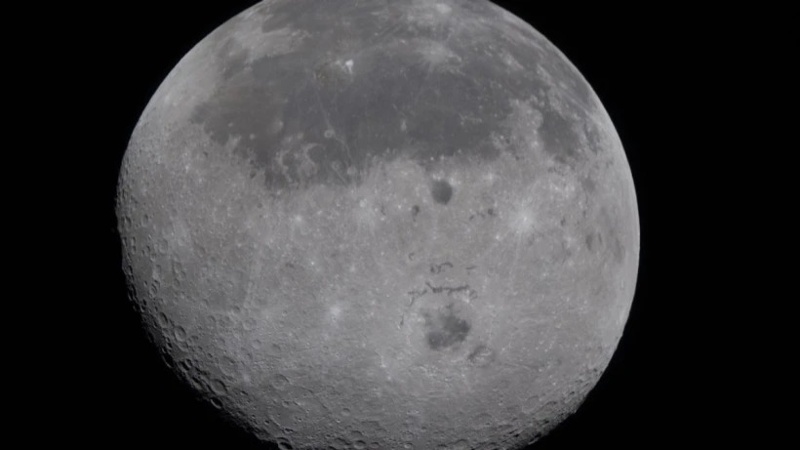 سۋرەتتە ايدىڭ ەكى بولىگى - بىزگە تانىس جاق بەتى مەن كوزگە كورىنبەيتىن ارعى جاعى قاتار بەينەلەنگەن. عالىمداردىڭ ايتۋىنشا، بىزگە جاقىن بەتىندەگى قارا داقتار جانارتاۋلار بەلسەندىلىگىنىڭ ىزدەرى بولسا، ال باتىس بولىگىندە الىپ وريەنتالە كراتەرى ورنالاسقان. ونىڭ ديامەترى شامامەن 600 ميلگە جەتەدى جانە ول ايدىڭ ەكى جاعىن دا قامتيدى.