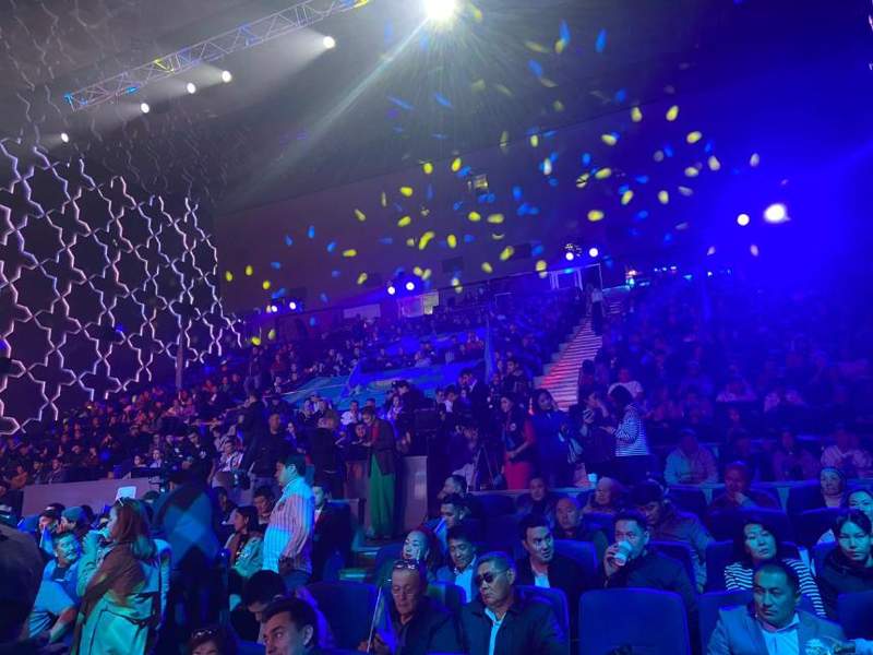 تاڭ اتا جينالعان GGG جانكۇيەلەرلەر تىكەلەي كورسەتىلىمدى ۇلكەن لەد ەكران ارقىلى تاماشالاۋدا. كەلۋشىلەردىڭ كوڭىل- كۇيى كوتەرىڭكى جانە قولدارىندا مەملەكەتتىك تۋ بار.