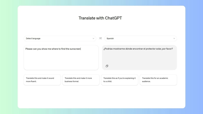 ChatGPT Translate قىزمەتى Google Translate جانە DeepL ءتارىزدى ينتەرفەيسكە يە. قازىرگى ۋاقىتتا ول 50 دەن استام ءتىلدى قولدايدى، بۇل Google Translate تىڭ 240 تان استام ءتىلىن قولداۋىمەن سالىستىرعاندا از.