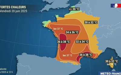 Météo-France جۇما كۇنى ءۇشىن برەتان مەن وۆەرن- رونا- الپ ايماقتارىن قوسا العاندا، 16 دەپارتامەنتتە قىزعىلت سارى دەڭگەيدەگى دابىل جاريالادى. يسپانيا مەن ۇلىبريتانيا دا بۇل ىستىقتان زارداپ شەگۋى مۇمكىن.