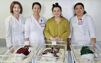 شىمكەنت قالالىق پەرزەنتحاناسىندا ۇشەم - ءبىر قىز جانە ەكى ۇل بالا - دۇنيەگە كەلدى. جۇكتىلىكتىڭ 31- اپتاسىندا جارىق دۇنيە ەسىگىن اشقان نارەستەلەردىڭ سالماعى - 975، 1765 جانە 1920 گرام بولدى. ولار بىرنەشە مينۋت ايىرماشىلىقپەن تۋىلدى.
