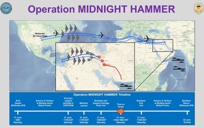 كەيننىڭ ايتۋىنشا، «Operation Midnight Hammer» اتاۋىن العان ميسسيادا جەتى B-2 Spirit بومبالاۋشى ۇشاعى بولدى. ولار يرانعا اۋەدەن سوققى جاساۋ ءۇشىن ۋايتمەن اۋە بازاسىنان شىعىسقا قاراي، ميسسۋريگە ۇشىپ شىقتى. ال ۆ-2 ۇشاعىنىڭ كەلەسى توبى الداۋشى اسەر قالدىرۋ ءۇشىن تىنىق مۇحيتى ارقىلى باتىسقا، امەريكالىق گۋام اسكەري-تەڭىز بازاسىنا قاراي باعىت الدى.