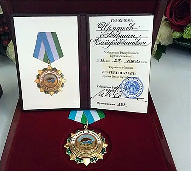 الەم بىرىنشىلىگىن ابىرويمەن وتكىزىپ كەلگەننەن كەيىن رافشان يرماتوۆتى وزبەك اعايىندارىمىز الاقاندارىنا سالىپ، وعان «وزبەكستان ماقتانىشى» دەگەن اتاق بەرىلدى. ودان بولەك، وزبەكستاننىڭ پرەزيدەنتى اتىنان «ەل جانە جۇرت قۇرمەتى» (ەل-يۋرت حۋرماتي) وردەنىمەن ماراپاتتالدى. وردەندى تورەشىگە ەلدىڭ پرەمەر-ءمينيسترى شاۆكات ميرزيەيەۆ تابىستادى.