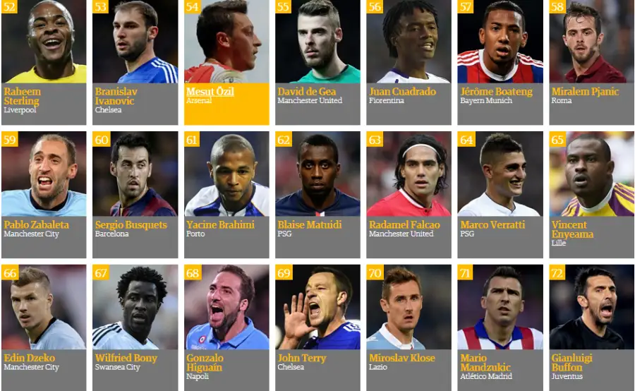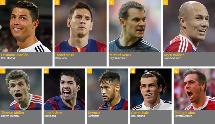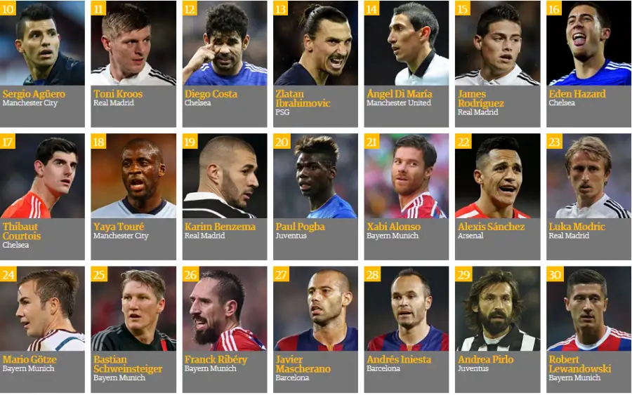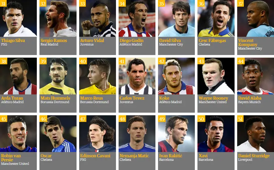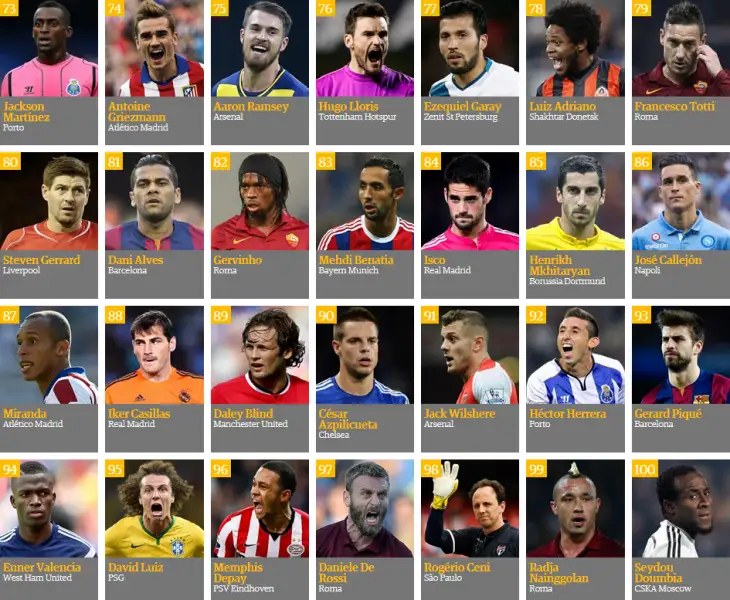 «The Guardian» رەيتينگىنىڭ ۇزدىك ۇشتىگىن قاقپاشى مانۋەل نويەر تۇيىندەپ تۇر. ول 2014 -جىلى گەرمانيا ۇلتتىق قۇراماسىمەن الەم چەمپيونى اتاعىن جەڭىپ السا، ميۋنحەننىڭ «باۆاريا» كلۋبىمەن ەل چەمپيونى اتاندى. سونداي- اق برازيلياداعى بىرىنشىلىكتىڭ ۇزدىك قاقپاشىسى اتانىپ، «التىن قولعاپ» سىيلىعىن جەڭىپ الدى.