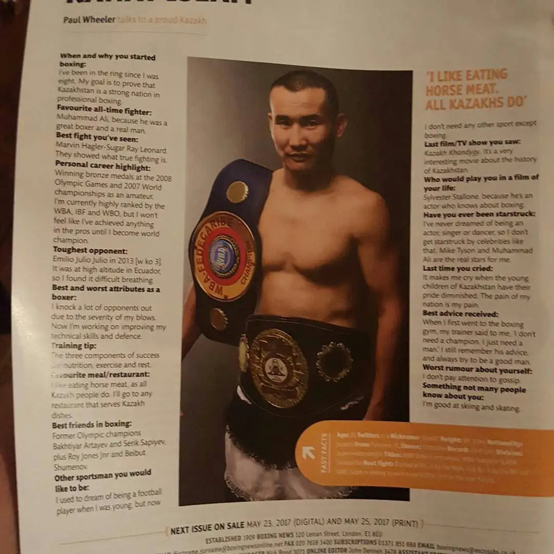 2008-جىلى وليمپيادا ويىندارىندا قولا مەدال جانە 2007-جىلى الەم چەمپيوناتىندا جەڭىسكە جەتتىم. قازىر مەن WBA، IBF، WBO رەيتىنگىندە جوعارى ساتىدا تۇرمىن. كاسىپقوي بوكستان الەم چەمپيونى بولماي دەمالۋعا ۋاقىت جوق.