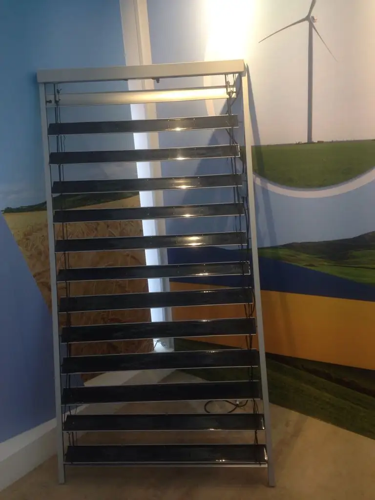 ەكسپوزيتسيا تورىنە سۋ مەن عيماراتتاردى جىلىتۋعا ارنالعان اگرەگات قويىلعان. كۇن ەنەرگياسىن جينايتىن پلاستينالاردىڭ كومەگىمەن كۇن ساۋلەلەرى ورتالىققا جينالادى. وندا شىنى تۇتىكشە تۇرىندەگى ۆاكۋۋم ورنالاسقان. ۆاكۋۋم سەلسي ولشەمىمەن 900 گرادۋسقا دەيىن قىزادى، وسى ارقىلى ەدەندى، باسسەيندى نەمەسە كىشىگىرىم ۇيلەردى جىلىتۋعا بولادى. ۇيىمداستىرۋشىلاردىڭ ايتۋىنشا، قۇرىلعىنىڭ 4 كۆت بولاتىن قۋاتتىلىعى ۇلكەن ۇيلەردى جىلىتا المايدى. دەسە دە، كۇنىنە 1000 ليتر سۋدى جىلىتۋعا قاۋقارى جەتەدى. اپپاراتتىڭ بىرەگەيلىگى سول، كۇننىڭ ورنالاسقان جەرىن ءوزى انىقتايدى جانە كۇنباعىس سەكىلدى پلاستينالارىن كۇنگە قاراي بۇرادى.