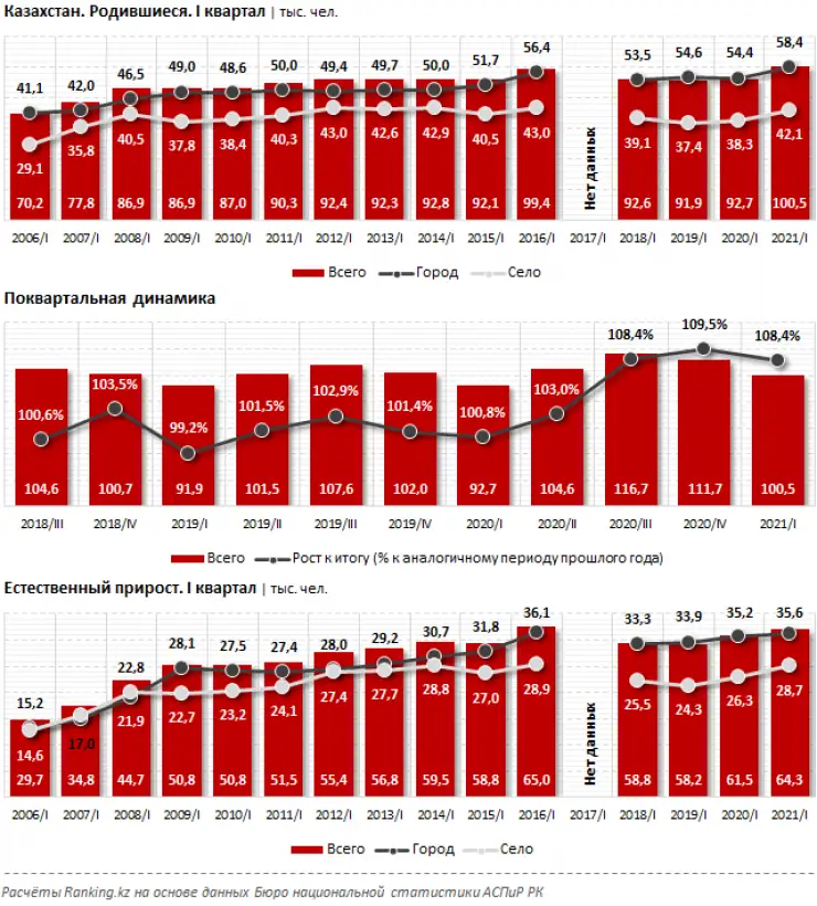 بيىل ءبىرىنشى توقساندا ەلدە 100,5 مىڭ بالا دۇنيەگە كەلگەن. بۇل سوڭعى جىلدارداعى وسى كەزەڭ بويىنشا ەڭ جوعارى كورسەتكىشى. بىلتىرعىمەن سالىستىرعاندا تۋىلعاندار سانى 8,4 پايىزعا جەتتى.